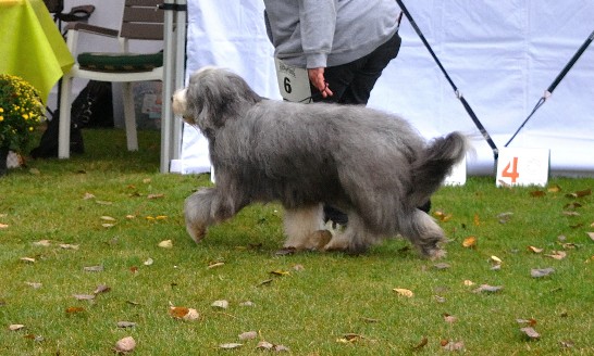 Ansprechende Gesamterscheinung, Kopf mit flachem Schädel, mäßiger Stopp, dunkle Augen, vollzahniges Scherengebiss, ausreichende Halslänge, fester Rücken, es fehlt Vorbtust, ausreichende Brusttiefe, gute Winkelung, insgesamt sollte er nicht dicker werden, korrekte Bewegung, sehr gute Fellanlage, ruhiges Verhalten.