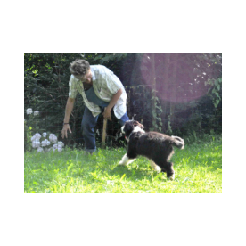 Täuble ist schwarz geboren und kam schon mit schwarzer Nase zur Welt. Von Anfang an zog sie uns in unseren Bann, und mit ihrer vorwitzigen, unerschrockenen und unbekümmerten Art waren wir ihr bald ganz verfallen.